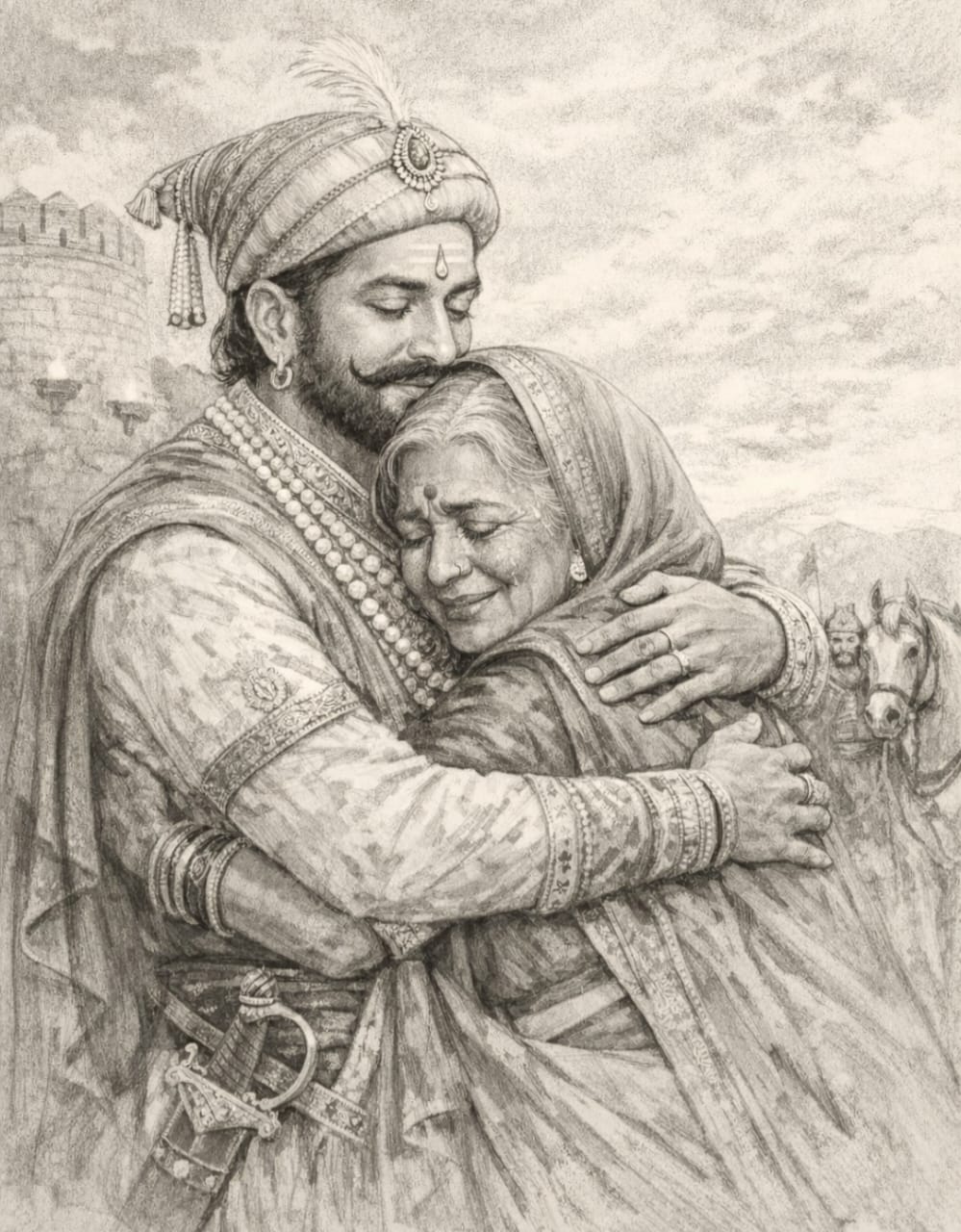 ఆ స్వరం విని శివాజీకి తల్లి జీజాబాయి పిలుస్తున్నట్టనిపించింది. ఒక్కసారిగా ఆయన గుండె తడిసి ముద్దయింది. కళ్లలో జలదారలు తడిసినా ఎవరికీ తెలియనివ్వకుండా చేతులతో తుడిచుకున్నాడు. రాణీబాయి ఎక్కాల్సిన తెల్ల గుర్రం ముందుకు వచ్చింది. శివాజీ స్వయంగా ఆమెకు చేయూతనిస్తూ మెల్లగా గుర్రంపై కూర్చోబెట్టాడు. గుర్రాల అడుగుల శబ్దం నిశ్శబ్దమయ్యే వరకు అక్కడే నిలబడి, తరువాత మెల్లగా కోట వైపు భారమైన హృదయంతో నడిచాడు.